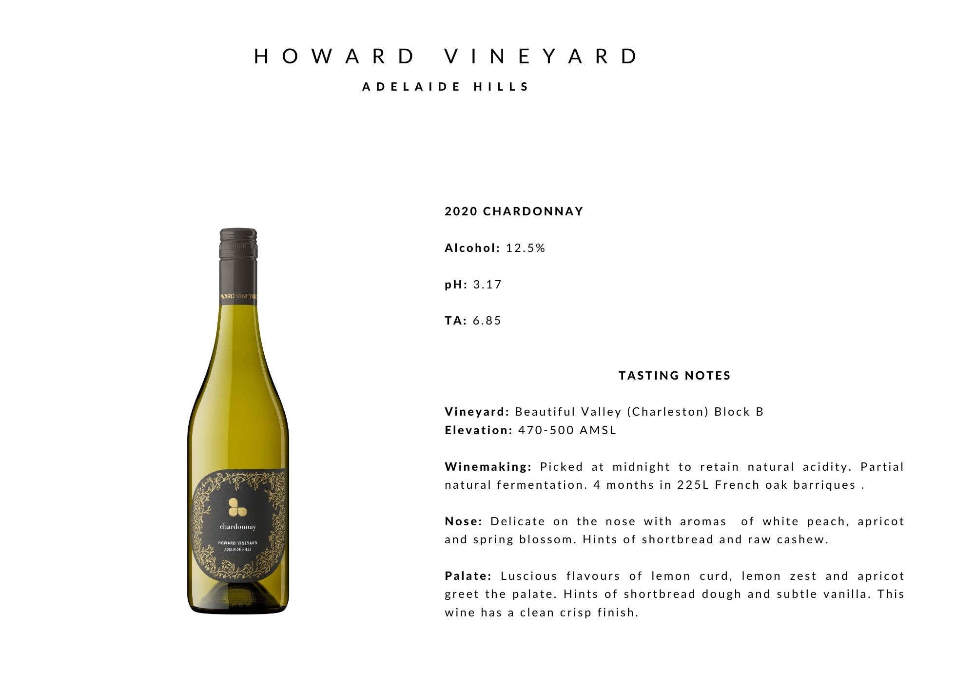 Head winemaker Tom Northcott’s winemaking approach is to pick at optimal ripeness for lean flavours to showcase the quality and true expression of their vineyards. Howard Vineyard wines are light to medium body with vibrant flavours and great natural acidity.