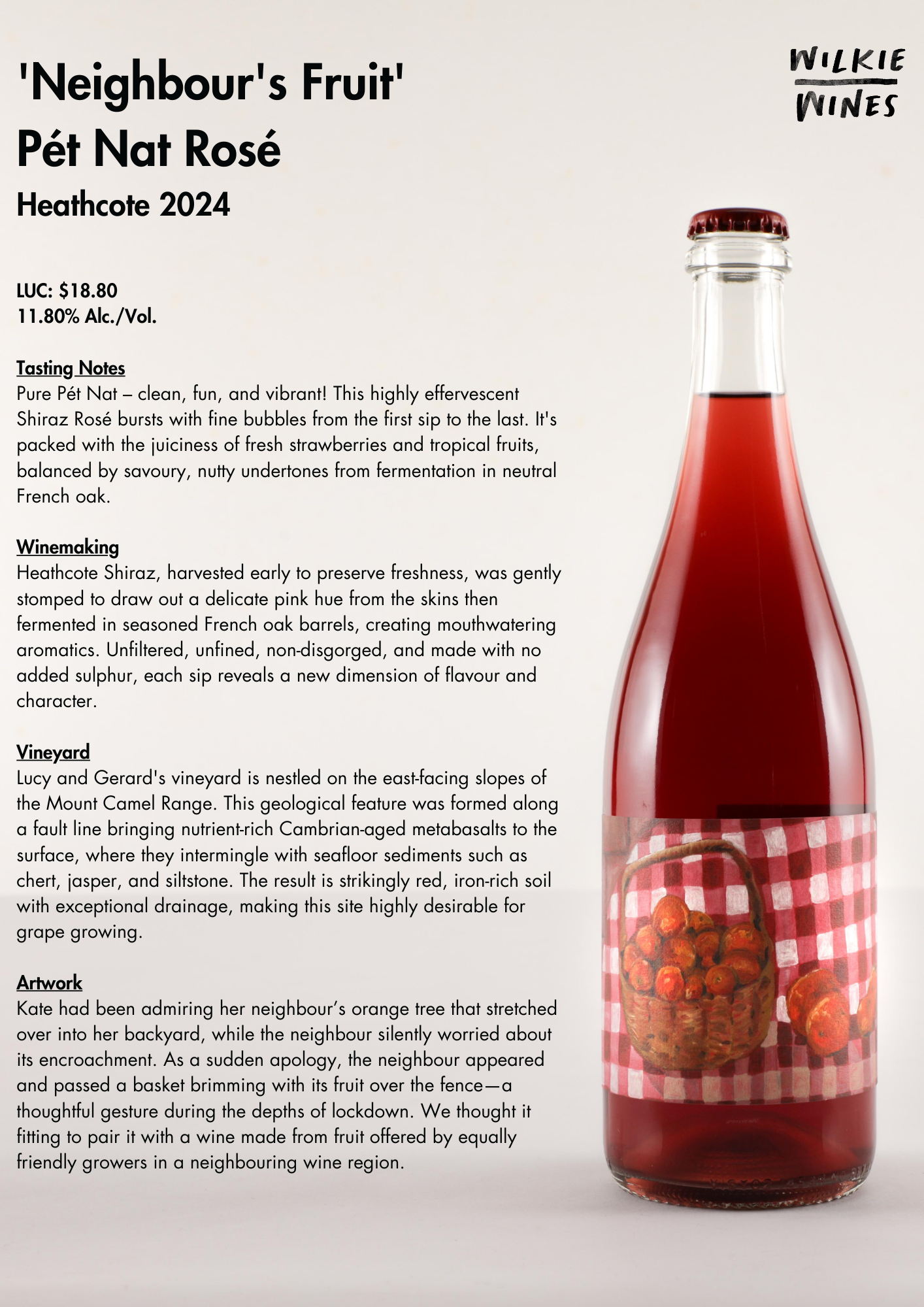 Pure Pét Nat – clean, fun, and vibrant! This highly effervescent Shiraz Rosé bursts with fine bubbles from the first sip to the last. It's packed with the juiciness of fresh strawberries and tropical fruits, balanced by savoury, nutty undertones from fermentation in neutral French oak.