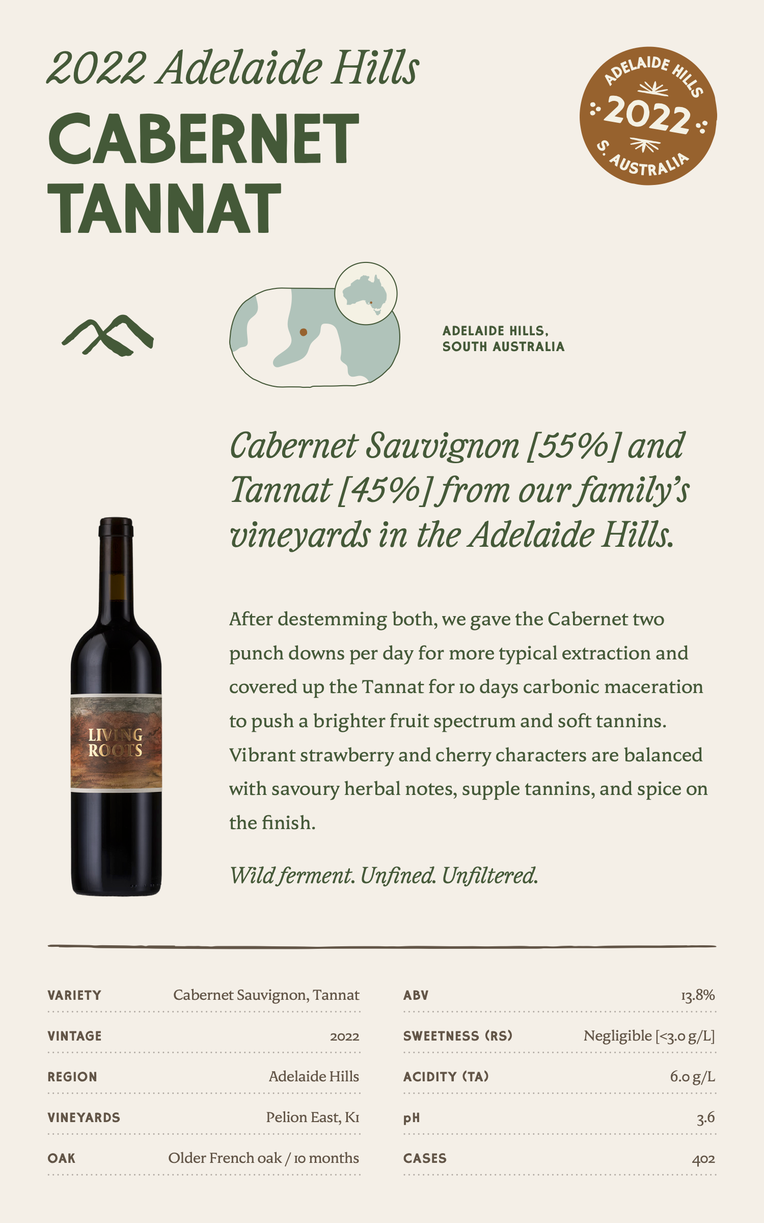 Cabernet Sauvignon [55%] and Tannat [45%] from our family’s vineyards in the Adelaide Hills. After destemming both, we gave the Cabernet two punch downs per day for more typical extraction and covered up the Tannat for 10 days carbonic maceration to push a brighter fruit spectrum and soft tannins. Vibrant strawberry and cherry characters are balanced with savoury herbal notes, supple tannins, and spice on the finish. Wild ferment. Unfined. Unfiltered.