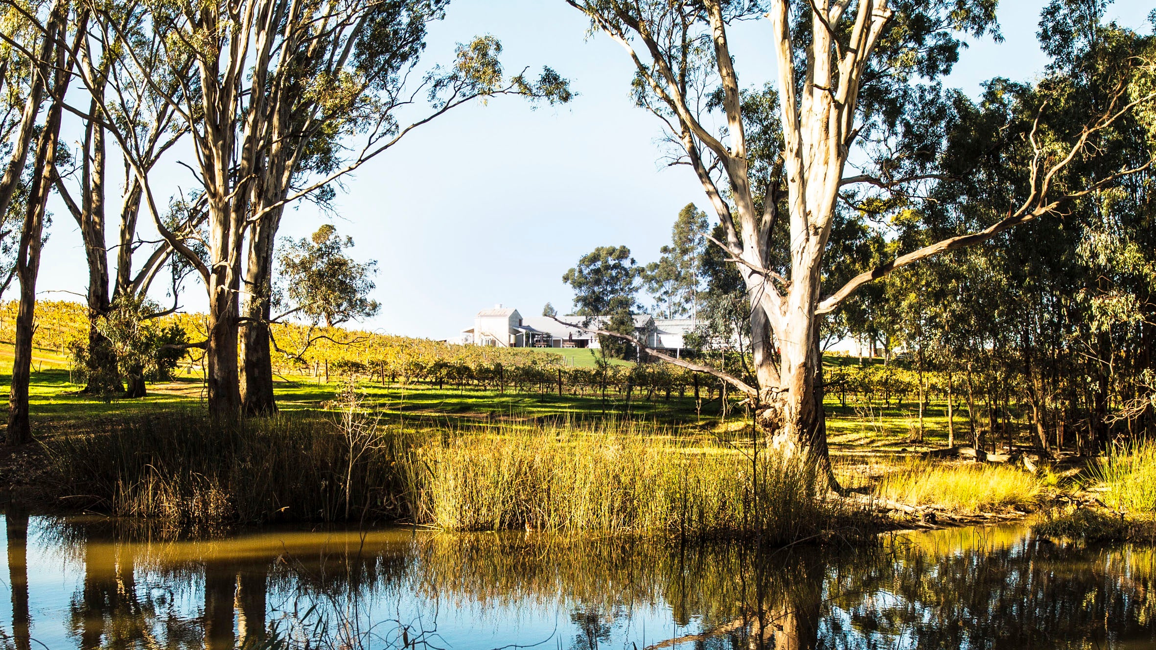 peaceful too. Pelicans spiral down to the lagoon and glide silently through the reflections of the towering gums along the waterline. The vineyards move slowly as well, with the lower temperatures helping draw out the growing season to maximise the development of intense fruit flavours. The vineyards are home to a mix of classic and curious varieties. From the usual suspects of Chardonnay, Pinot Gris, Shiraz, Durif and Muscat to the lesser known Cabernet Franc.